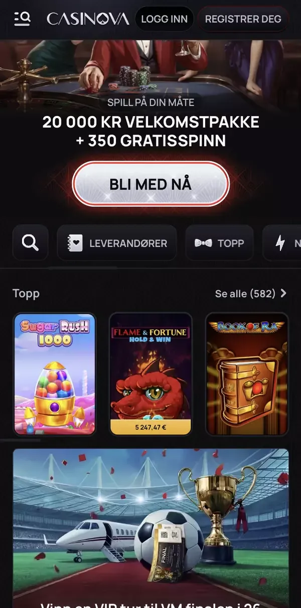 På mobil beholder vi det samme kjerneinnholdet du ser på desktop: spilleautomater, live dealer-bord, klassiske bordspill, jackpoter, video poker, bingo og skrapelodd, pluss sportsbetting der det er tilgjengelig. Når du vil ha variasjon, gjør biblioteket vårt med 9 200 spill det enkelt å bytte fra Casinova-spilleautomater til live roulette på sekunder. Du kan også følge kampanjer og se hvert Casinova-bonus-tilbud fra ett sted, med tydelige vilkår vist før du velger å delta.